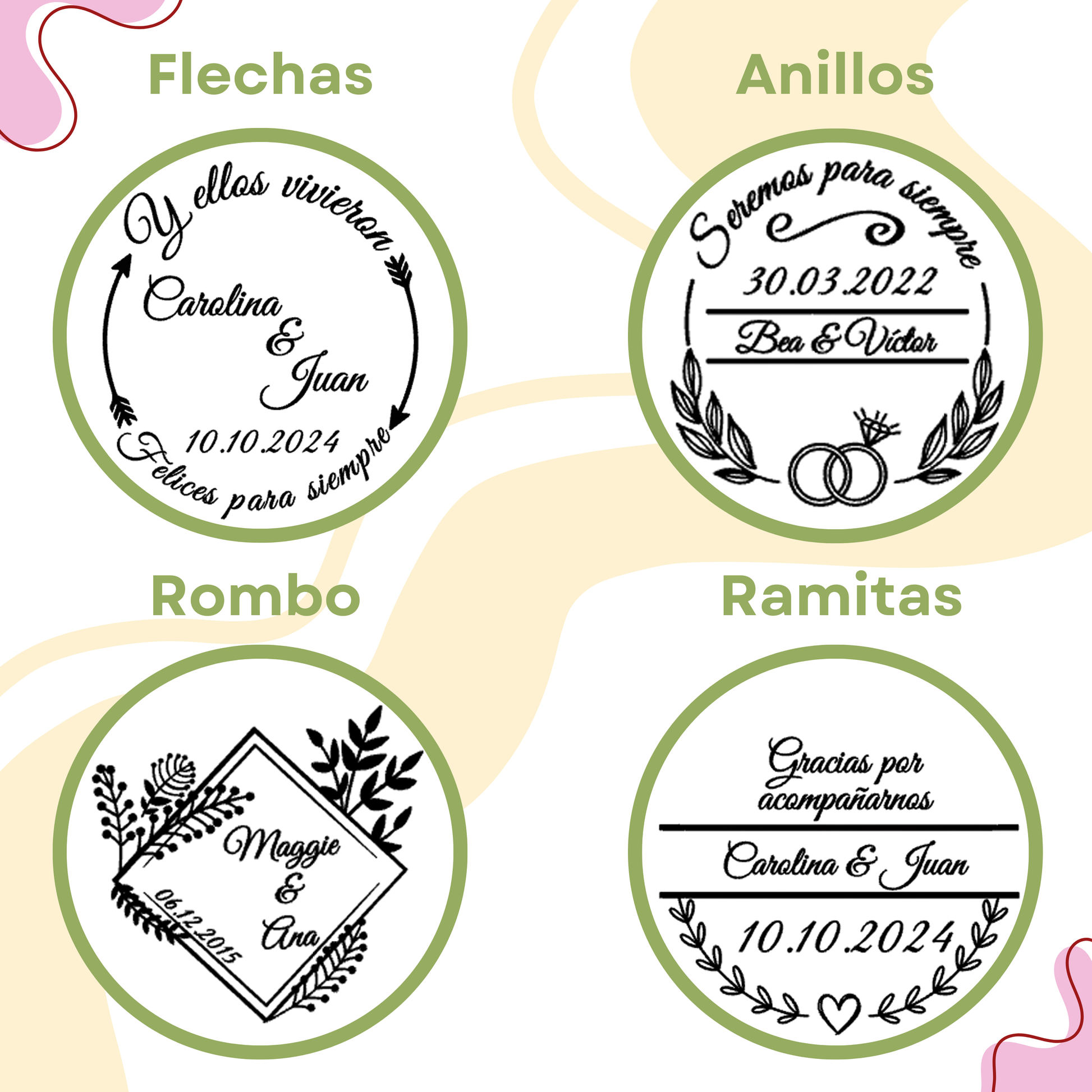 Escoge entre los diseños que te indico y añade los datos necesario para la personalización (nombres, fechas, frase/s, ...).